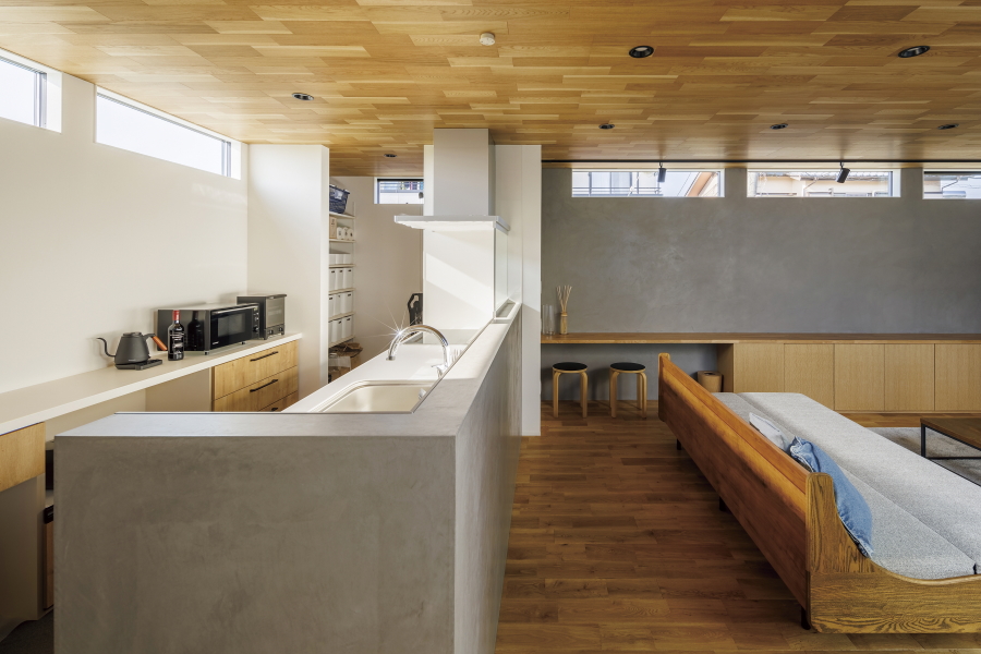 | コンセプト | 住宅街の一角で元々お住まいだったお家の建替えをご検討だったW様です。北道路で2階建てのお家に囲まれており、周りからの目線をどう配慮するかがポイントでした。 北側にLDKを配置し、建物の中心に中庭を設け、中庭から光を取り込むことで外側の外壁には大きな窓はなく、外からの目線を気にせず開放感のある室内を実現できました。外観はブラックのガルバリウムとレッドシダーでメリハリのある外観に仕上がりました。室内はW様こだわりの塗り壁がライトアップされて落ち着いた空間を演出してくれています。床と天井にはナラの無垢材を採用し温かみのあるリビングで開放感があり、外観からは想像できない室内となっております。 |