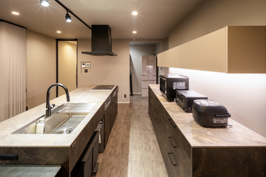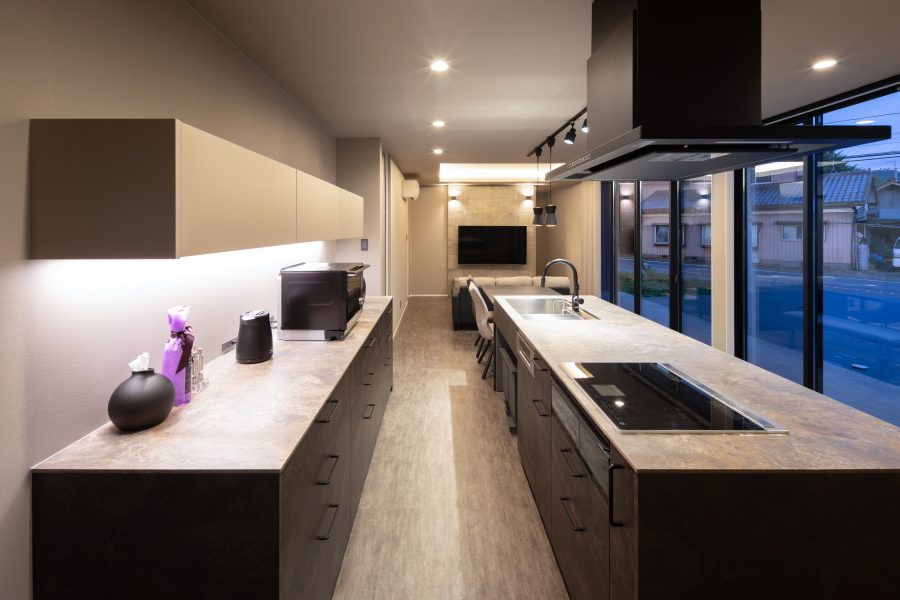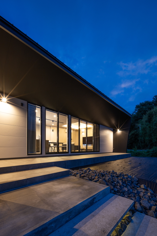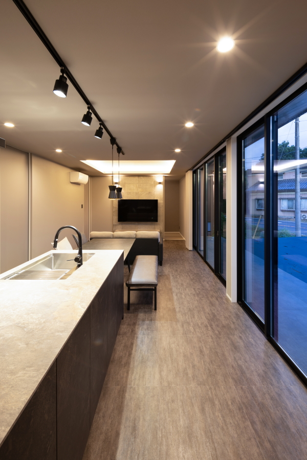 | コンセプト | 緑の山々と田園が広がる閑静な場所に、夜空の蒼と建物のシャープな光のコントラストが非常に美しい、洗練されたデザインの住宅が完成しました。 お施主様が生まれ育った環境、長年にわたり計画されたマイホーム建築、叶えたい要望を十分に取り込み、お施主様のライフスタイルを考慮しつつ、設計上省くことができるものは全て省き、設計に取り組みました。最も重要視したのが、緑が多い風景と馴染むファサード(建物正面部分・外観デザイン)となります。 栃木県芳賀郡益子町は、豊かな自然に囲まれ、ゆったりとした時間が流れる一方で、多くの作家や職人が集まる活気に満ちた側面を持ち、陶芸と里山の魅力が融合したクリエイティブな街です。アスペクト比(縦横の比率)を考慮し、非常にバランスが取れた設計形状としました。室内インテリアにおいても、お施主様のこだわりが沢山詰め込まれており、配色、素材等の選定も箇所毎ではなく、家全体のバランスを十分に考慮されたホテルライクな室内インテリアとなっています。 「どんな家が欲しいかではなく、どんな暮らし方がしたいか」 この言葉は、携わるお客様全ての方へ、最初にお伝えする言葉です。 |