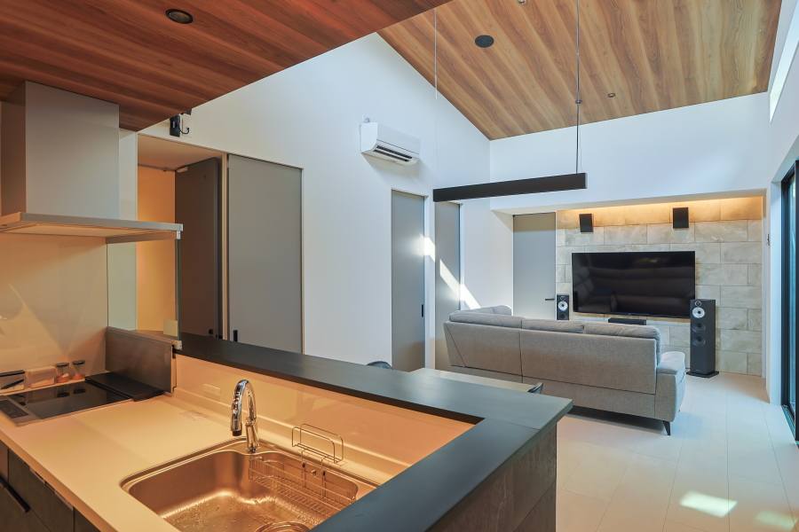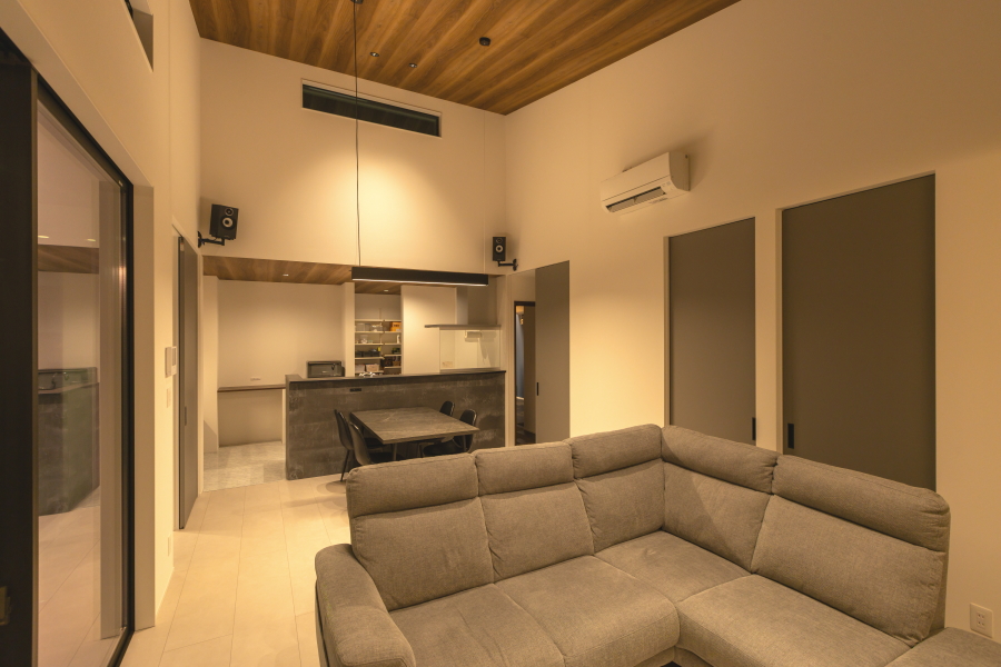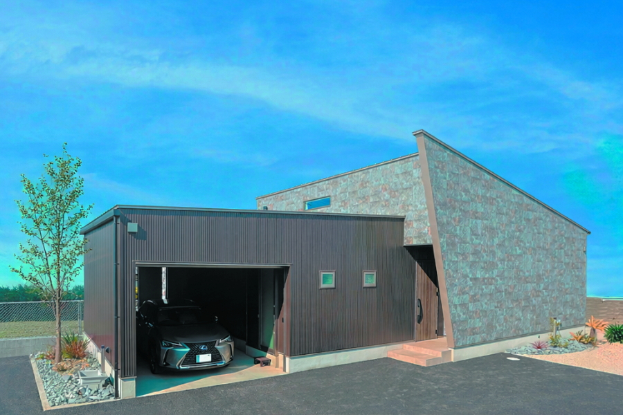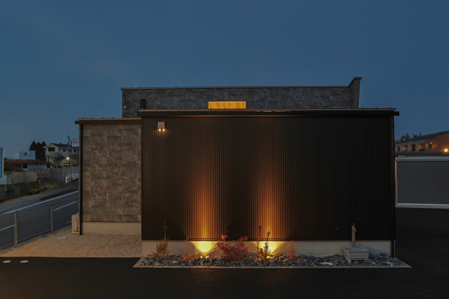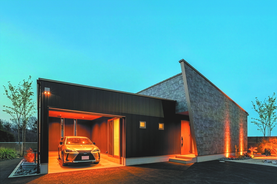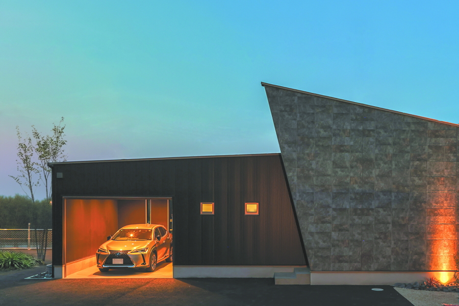 大通りに面した住宅地内にある敷地のため、プライバシーの確保を重視した間取りとなっています。オーディオルームのご希望もあったため、室内の生活音も含め、極力外に音が漏れないような設計にし、さらに勾配天井部の窓や中庭を配置することで外の光も採り入れています。 ガレージから、直接シューズクローク・パントリー・玄関・中庭へ移動ができ、家の中心にLDKを配置することで、全体的に効率の良い導線を確保できました。また、室内干しスペースに隣接してファミリークロークを設けることで、家事の導線も考慮しています。 外観は、外側の窓を極力排し、無機質な素材を採用することにより、「家っぽくない家」というご要望を叶えました。正面に回り込むと、エッジの効いた外壁が魅力的です。 |