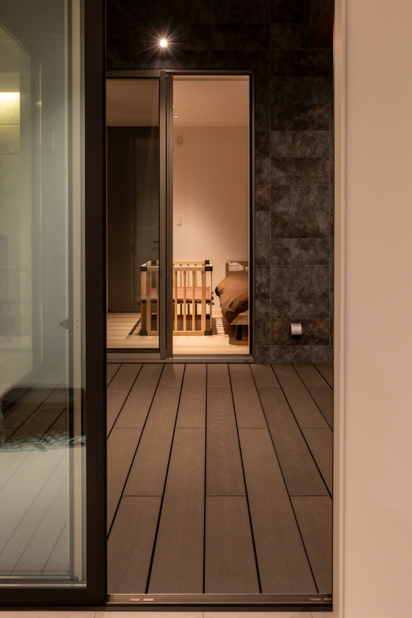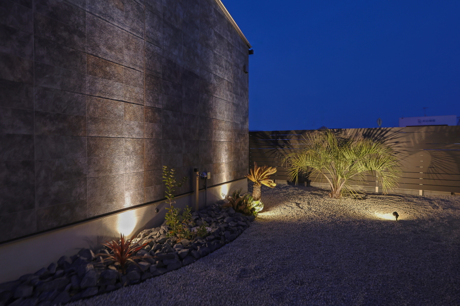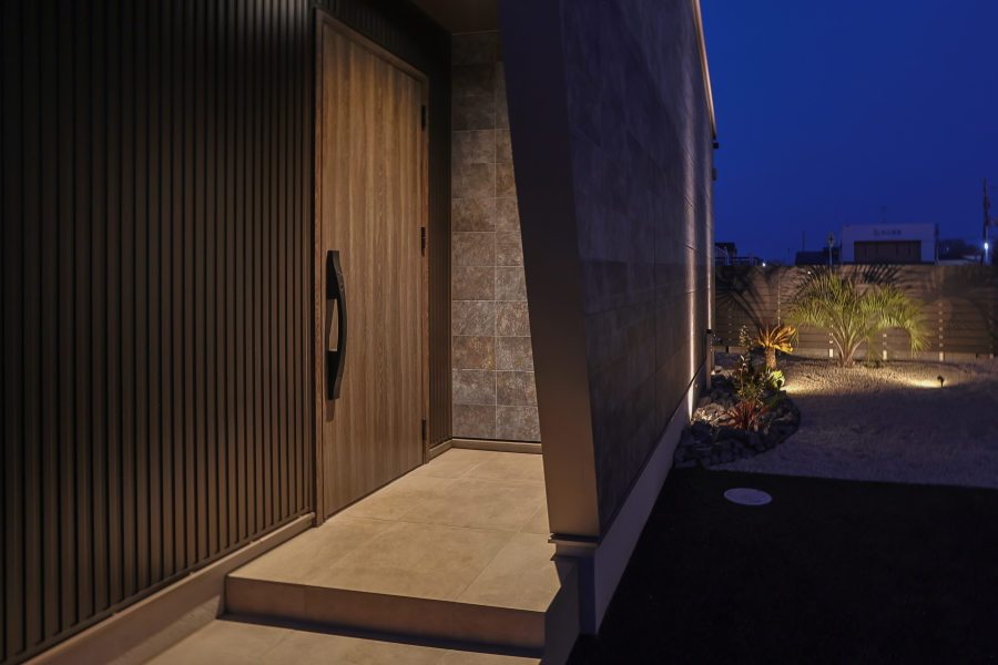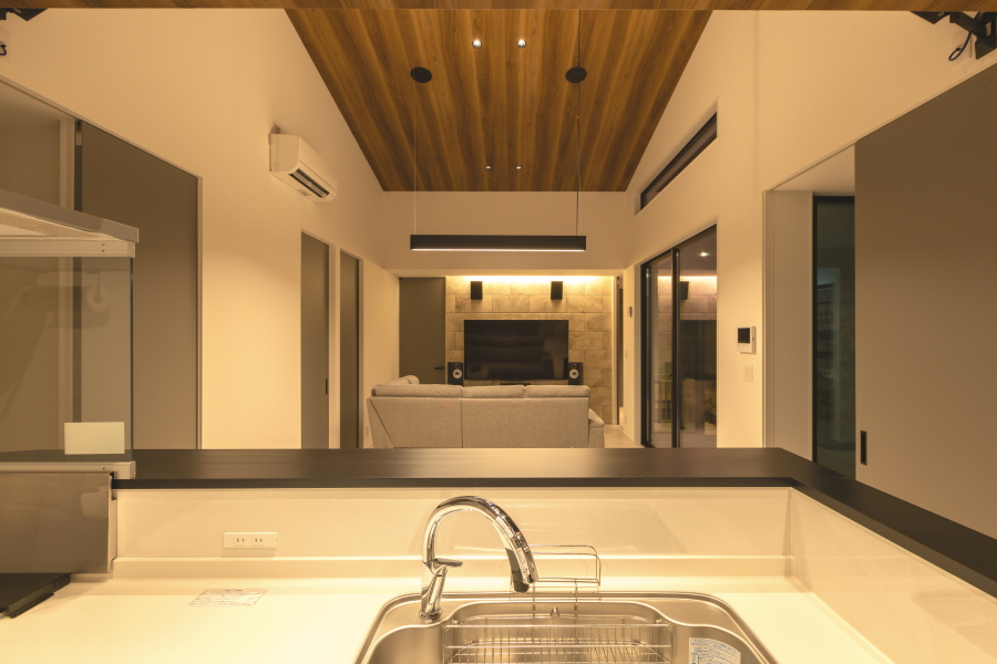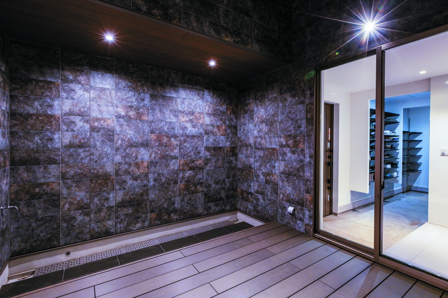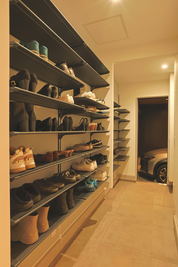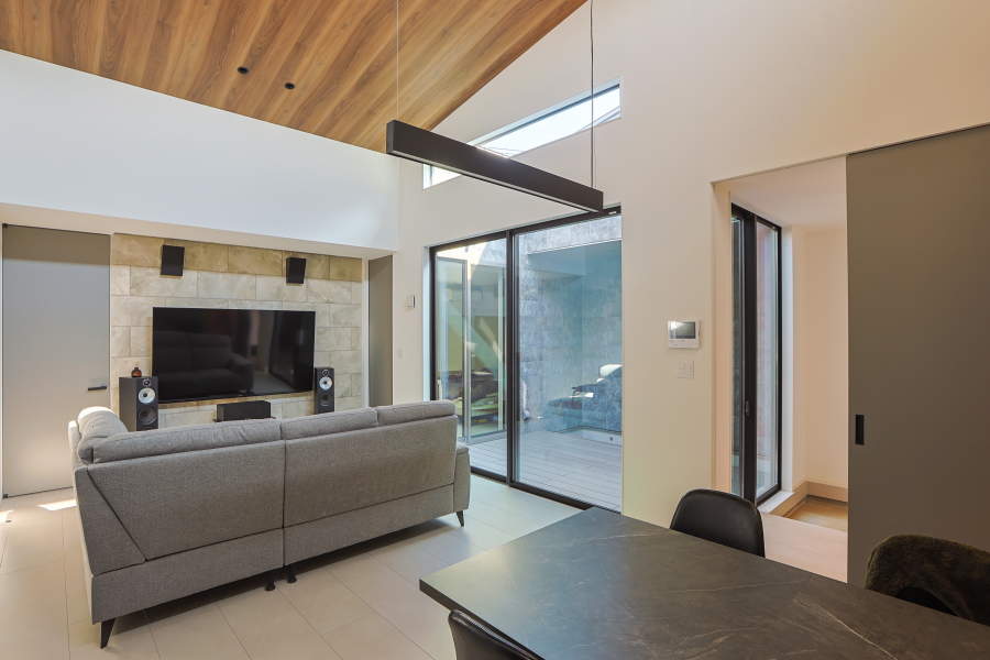 大通りに面した住宅地内にある敷地のため、プライバシーの確保を重視した間取りとなっています。オーディオルームのご希望もあったため、室内の生活音も含め、極力外に音が漏れないような設計にし、さらに勾配天井部の窓や中庭を配置することで外の光も採り入れています。 ガレージから、直接シューズクローク・パントリー・玄関・中庭へ移動ができ、家の中心にLDKを配置することで、全体的に効率の良い導線を確保できました。また、室内干しスペースに隣接してファミリークロークを設けることで、家事の導線も考慮しています。 外観は、外側の窓を極力排し、無機質な素材を採用することにより、「家っぽくない家」というご要望を叶えました。正面に回り込むと、エッジの効いた外壁が魅力的です。 |